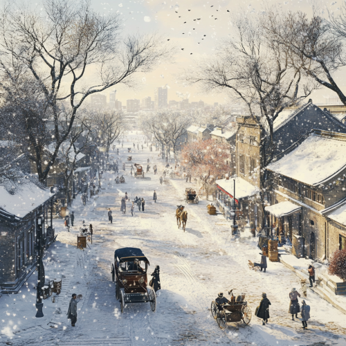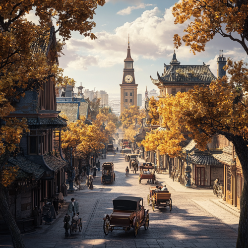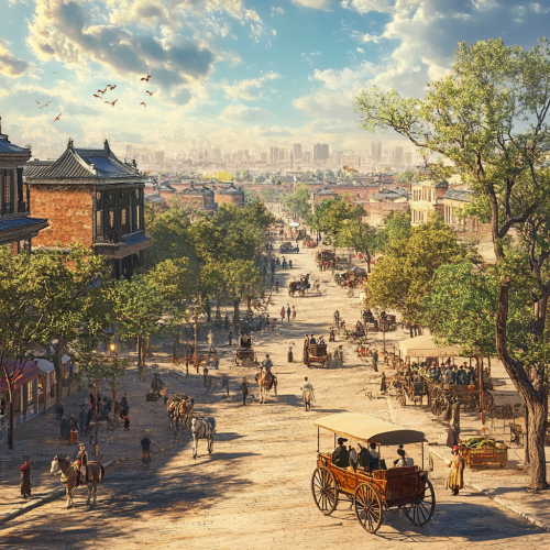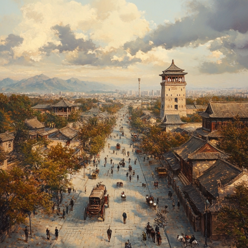 What Beijing looks like past, fascinating, 1900s, imaginative, realistic, photographic of the city of Beijing, background Beijing city view, incredible, creative, tower 3d render, old Washington houses, old cars, old people, horse carriage, trees, painters who paint
