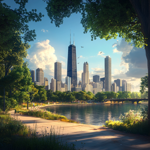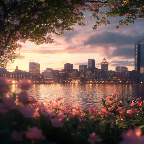 What Boston looks like, fascinating, 2024s, imaginative, realistic, photographic of the city of Boston, background Boston city view, incredible, creative, city 3d render, city lights, nowadays a day, Boston summer flowers, magneficent sunset