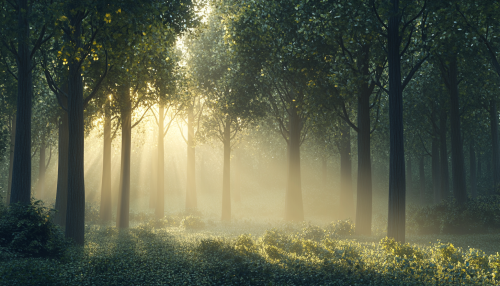 3D render of a mysterious, dense forest bathed in the soft light of dawn. The tall trees, with their thick trunks and intertwining branches, create a canopy that filters the morning sunlight, casting long shadows and illuminating patches of fog that hover close to the forest floor. The scene should evoke a sense of wonder and mystery, with subtle details like dew-covered leaves and distant sounds of nature --ar 7:4
