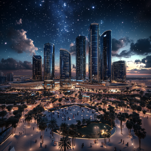 What Abu Dhabi looks like, fascinating, 2024s, imaginative, realistic, photographic of the city of Abu Dhabi, background Abu Dhabi city view, incredible, creative, city 3d render, city lights, Arabic people, night, stars, skyscraper