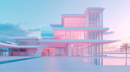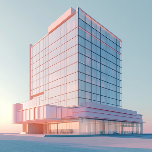 Create a hyper-realistic, delicate 3D render of a modern hotel under construction. The hotel features a rectangular structure with a mix of soft pastel colors, primarily pink and blue tones. It has multiple stories with large glass windows and flat facades. Include fine details such as realistic shadows, smooth textures, and lighting that enhances the structural outline. The building should have clear, crisp edges, with realistic materials and textures, matching the exact proportions and layout of the hotel in the image. The surroundings should reflect an urban setting with smooth pathways and minimalist landscaping. The entire scene should have a futuristic, modern aesthetic with soft reflections on the glass windows and clean architectural lines. v6.1