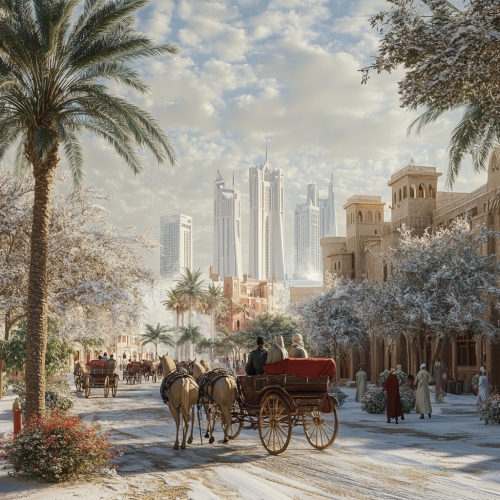 What Abu Dhabi looks like past, fascinating, 1900s, imaginative, realistic, photographic of the city of Abu Dhabi, background Abu Dhabi city view, incredible, creative, old town 3d render, horse carriages, trees, old Abu Dhabi houses, people in the 1900s, trees, flowers, camel, desert, evening, city lights, snow