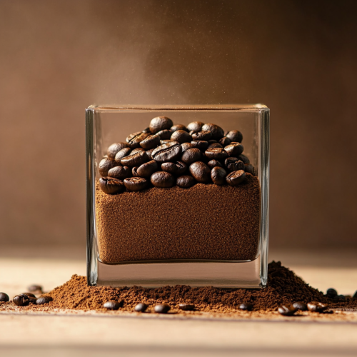 Showing coffee powder with Arabica coffee beans in a square glass container with a gradient background inspired by the color of coffee with a light angle of 45 degrees 1:1 --v 6.1