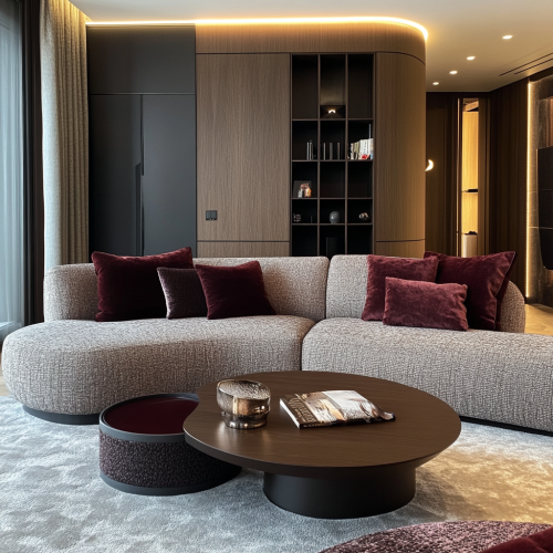 a modern and elegant livingroom with dark oak coffe tables and at the same look ımagine a extra comfort sofa with mody maroon fabrics with 2025 furniture curve trend