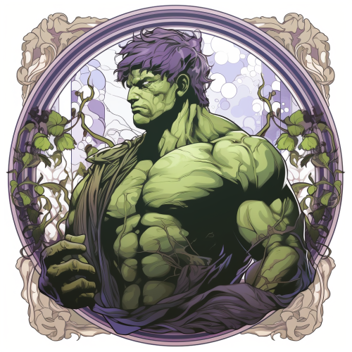create a gothic image of The Incredible Hulk in the style of Art nouveau and alphonse mucha, green, purple, Silver, torn and tattered cloth draped in the background, male subject, vector, sticker