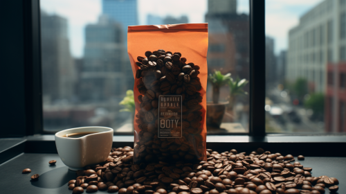 Package of multiple coffee beans full of individuality, object, illustration, window outside newyork, --ar 16:9