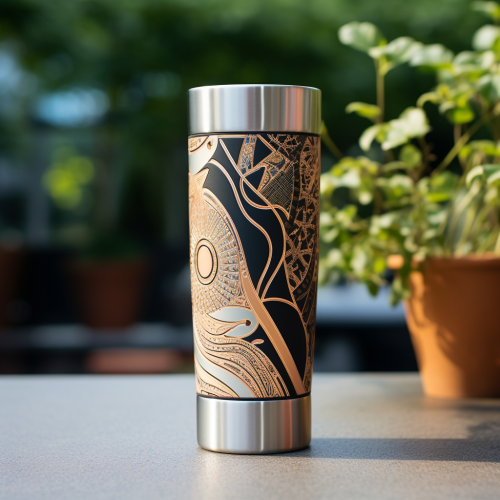 A modern and creative designed coffee steel tumbler, minimialistic style, with a sleeve for holding