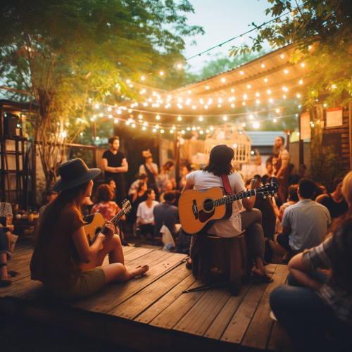 "Freshly roasted coffee beans, bustling music concert background, coffee products displayed on a vibrant market stall, poster-style design, dynamic lighting, rich colors, close-up of coffee beans with glossy texture, diverse crowd enjoying music in the background, energetic atmosphere, vintage-inspired typography for coffee product labels, artistic blend of concert and coffee theme, high-contrast imagery, detailed texture of coffee beans and packaging materials, lively and inviting ambiance, perspective view of the stall with music stage in the distance