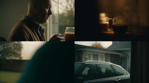 Storyboard of a man leaving his house, getting into his car, driving to a coffee roastery, buying coffee, returning home, and preparing it using a V60 coffee dripper. Show each step in a realistic, cinematic style, capturing emotions and atmosphere, with warm, inviting lighting throughout. --ar 16:9 --v 5.0