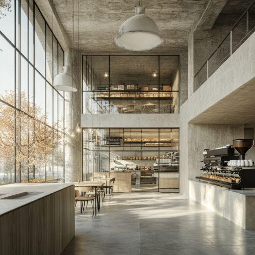 bakery factory and cafe roasting place , light colors, concrete, Glass walls for the bakery, Work space for bakers on the second floor like a mezzanine, Large windows to the sunny park A large coffee roaster in a separate room behind glass wall