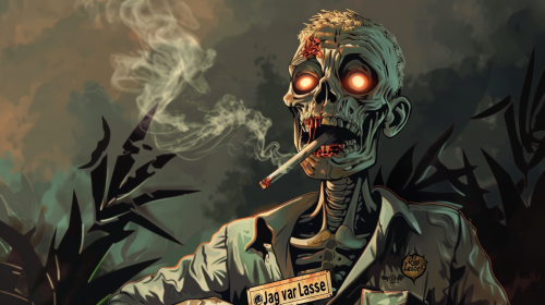 a very dead zombie smoking with a cool name badge with text "Jag var Lasse" style by George Andrew Romero --v 6.0 --ar 16:9