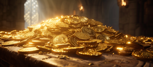a huge pile of gold coins on a table, unreal engine 5 render, fantasy, dramatic perspective, --v 6.0 --ar 23:10