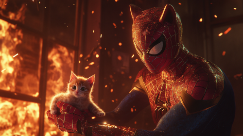 "A heroic scene of Cat Spider-Man saving a small kitten from a burning room. The room is engulfed in flames, with smoke billowing from the ceiling. Cat Spider-Man, wearing a Spider-Man suit with cat-like features (pointed ears, whiskers, and a tail), cradles the frightened kitten in his arms. The intense fire glows around them, with shattered windows and debris falling. The scene captures urgency, with Cat Spider-Man swinging towards a window using his webbing, escaping the blaze. Cinematic lighting highlights the heroic moment, with fiery reflections dancing off Cat Spider-Man’s suit. ultra realistic --ar 16:9