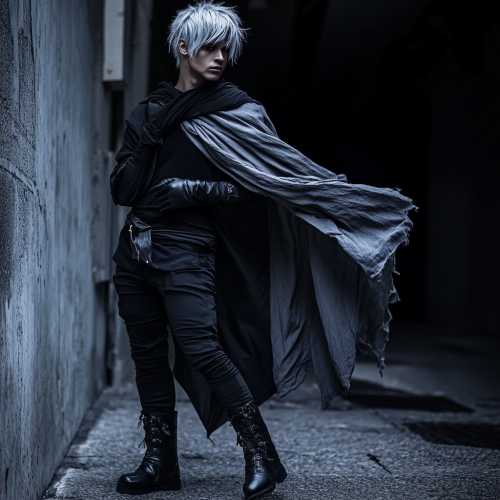 A stylish young man with silver hair wearing black ankle boots, fingerless gloves, grey jacket draped over shoulders, black pants, and a black shirt, with a flowing cape adding a dramatic flair, standing confidently against a dark urban backdrop. The sleek silver of his hair catches the moonlight, creating a striking contrast to the monochromatic ensemble, evoking a sense of mystery and intrigue.