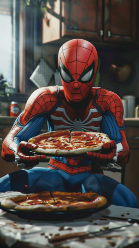 Visualize Spider-Man, fully suited with his mask still on, seated at a dining table. He's holding an entire round pizza with both hands, poised to take a big bite. The table is otherwise empty, focusing all attention on Spider-Man and his pizza. The setting is simple and homey, with kitchen details softly blurred in the background. This scene captures a light-hearted moment of Spider-Man enjoying a break in his superhero duties, indulging in a favorite food. --ar 9:16 --v 6.0