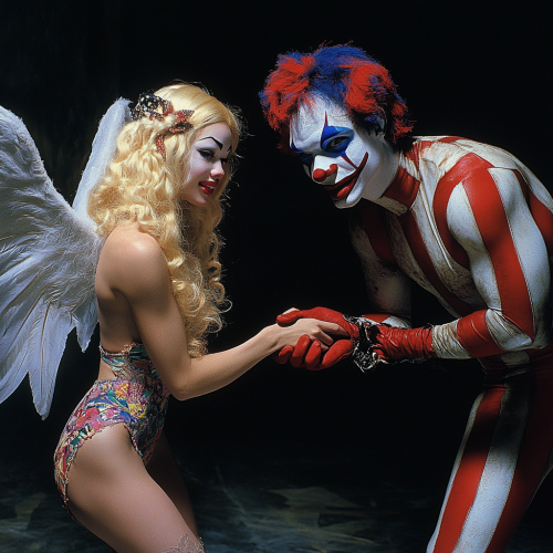 Stanley Kubrick, Eyes Wide Shut, occult mysticism beautiful cyber angel girl with blonde hair and wings. She is shaking hands with a sleek clown, alluringly and elegantly. The clown has white, red and blue face paint. The clown is wearing a Spider-Man costume. Legs and skin showing --ar 1:1 --style raw --v 6.1