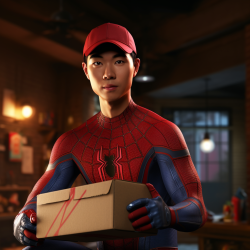 asian spider-man with an empty box in his hands, cinematic, realistic, 8k