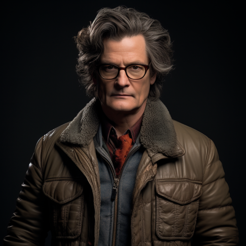 colin firth has spider-man, wearing a large gray jacket, and a funny wig, photo realistic, studio lighting, full body