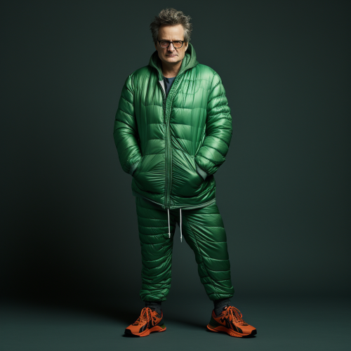 Colin Firth as a full-bodied spider-man. he's standing upright and tall. he's wearing a funny green wig, and a David Byrne-style large grey jacket. And he has Nikes on his feet. photo realistic, studio lighting, full body.