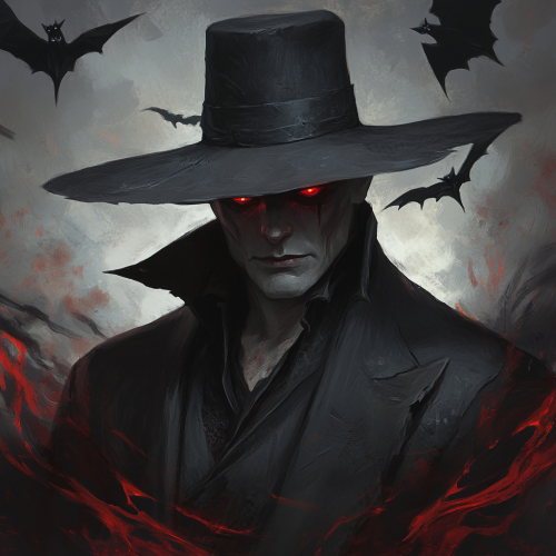a vampire with grayish skin and thin, sunken features. He is wearing a wide brimmed black hat and clothing befitting a lord. His eyes glow red, and bats swirl around him
