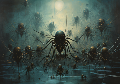a painting of an oil that is depicting a large group of spiders, in the style of futurist gothic, luminous spheres, dusty piles, solarization, dark gold and cyan, intricate webs, transportcore --ar 10:7