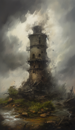 oil painting of a tower collapsing in a thunderstorm --ar 11:19 --v 5.0