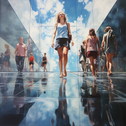 A professional businesswoman stands in a glass-walled office, gazing out at a vast, illuminated city skyline. Her reflection merges with the view, symbolizing her connection to the world of success. The office is minimalist and modern, with soft lighting adding depth to the scene, hd quality, photorealistic --ar 16:9 --v 6.0