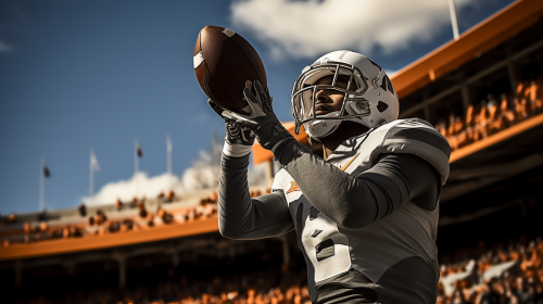 college football. Action shot on the field. Black and white with vibrant color splash. Full body shot. Jersey number “8”. Rear extreme low angle shot. Quarterback scoring game winning touchdown in final seconds of the game. In the style of a sports illustrated cover photo. Cubist style. Dramatic. Award winning. Packed stadium. Extreme blue skies. Exciting. Photorealistic. Black and white. High - end. Stylish. Important. Mysterious. Shot with a Pentax. K - 3 III Monochrome. --ar 16:9 --q 0.5 --s 750