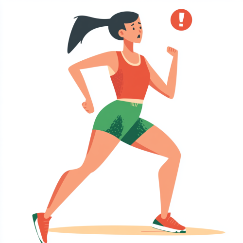A stylized illustration of a woman with a ponytail, wearing a red tank top and green shorts, pulling on her own leg. Her upper body is slim, while her lower body appears larger. An exclamation mark icon is placed above her head, and the background is white.