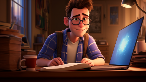 college student writing in the style of pixar --ar 16:9
