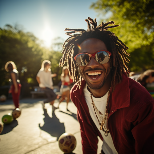 Photo Type: sports editorial, HD, shot on angenieux 45-90mm f/2.8, Subject Focus: a skinny black male, early 20’s, eccentric laughing college student with wild dreads, wearing sunglasses, playing bocce ball, friends in background, Color Tone: warm, earthy ambiance, natural, Springtime, Setting: Catskills resort backyard area Bocce court, Atmosphere: party time, playful, relaxed, goofy, laughing, Texture: detailed, vintage, Mood: silly, fun, vacation, Composition: casual sports photography, Lighting: HD, 4K, cinematic natural light, sabattier filter style raw, ar 4.5, v6.0