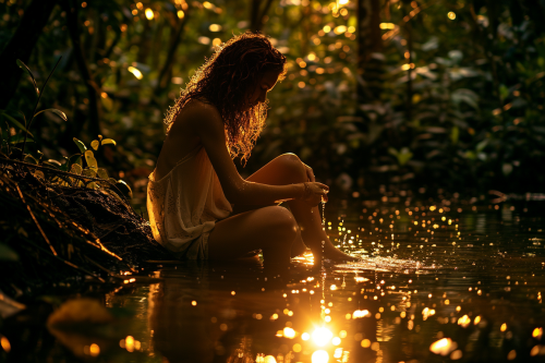 colombian beautiful young freckles curly touching her legs as watering slowly running one foot entering the forest pond photorealistic nighttime glow --ar 9:6 --v 6.0