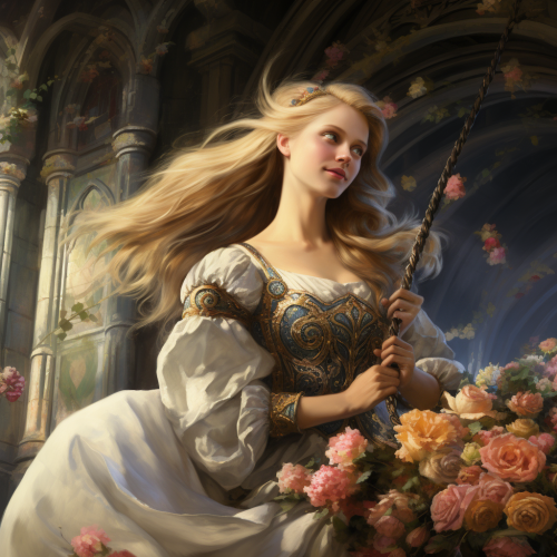 gorgeuous german maiden riding a unicorn with a golden retriever --s 250