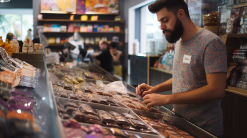 a person buying a bar of chocolate in a store in medellin, colombia, 4k --ar 16:9