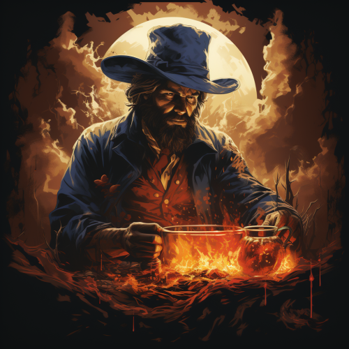 a design of a man boiling a witch in a large cauldron. The man's arm has a Betsy Ross American flag on one arm. The man has a buck on his pilgrim hat. The man is holding a musket in his impressively muscled arms. --s 500