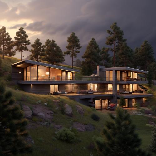 multiple connected buidings, on hillside, simple gable roof, Nordic architecture style house residence, location south of boulder Colorado, forest foothills with pines, simple forms, earthy, blends with landscape, perching views of valley, indoor outdoor, sunset, time of day post rain. 8k. Kodak film. Hyper realistic
