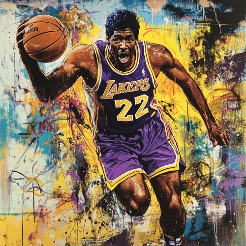 A bold, graffiti-style mural of Magic Johnson, emphasizing his larger-than-life personality and legendary career. The design should incorporate abstract, spray-painted lines and vibrant colors, with Magic depicted in his classic Los Angeles Lakers jersey, with the number 32 prominently featured. His figure should be dynamic, in action, either passing or dribbling a basketball, capturing his iconic playmaking. The background should feature urban textures, such as concrete walls, brick, and street art elements, with graffiti tags, splashes of paint, and energetic, chaotic lines. Include iconic symbols like basketballs, championship rings, and the Los Angeles skyline subtly blended into the design. The color palette should include Lakers purple, gold, and highlights of electric blue, with glowing accents and neon effects. Stylized text that reads 'Magic' and '32' should be incorporated, using a graffiti font to enhance the street art vibe. The overall effect should be intense, urban, and visually captivating, celebrating Magic Johnson’s influence both on and off the court. --v 6.1
