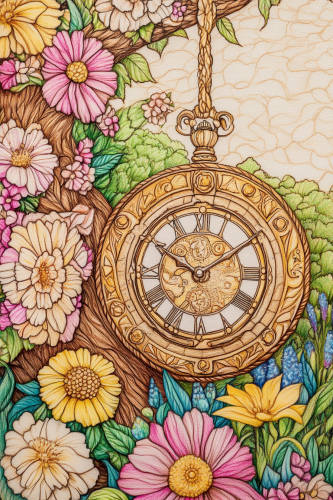 Colored pencil sketch of a clock with melting numbers draped over a tree branch in a surreal, dreamlike garden where time seems to flow in multiple directions --ar 2:3 --chaos 100