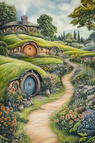 Colored pencil sketch of a peaceful hobbit village nestled in rolling green hills, with cozy, round houses and whimsical, flower-filled gardens --ar 2:3