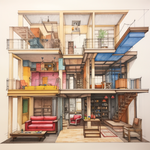 Interior design sketch of floor plan, colored pencil, French Tudor