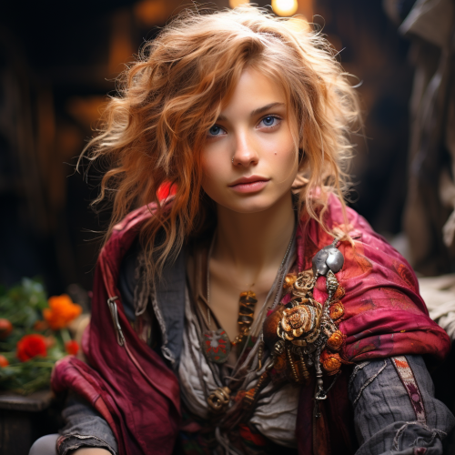 A 35 year old female magic fighter, pale skin, very short strawberry blonde hair, pixie, button nose, cute, wise, savage, colorful tribe clothes, portrait, Photography --style raw --s 750