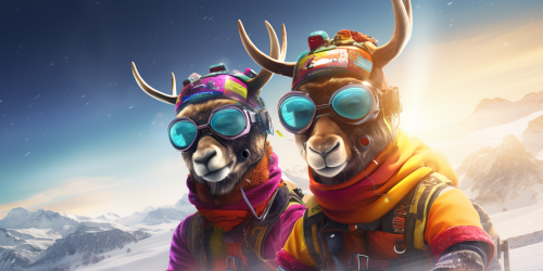 an AI robot posing for an LL Bean holiday catalog from the waist up. wearing colorful winter gear and goggles vibrant --ar 64:32