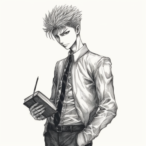 **male anime character handrawn in the style of Yusuke Murata. Male, full body, short swept back hair and short beard. Holding a grimoire. One punch man manga style. Yusuke Murata. --s 750 --v 5.1