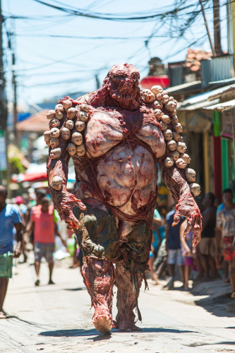 A full-body photo of an extremely large man made entirely out of meat, covered in baby heads, walking through the slums of Rio. --ar 2:3 --quality 2 --v 6.1 --no people