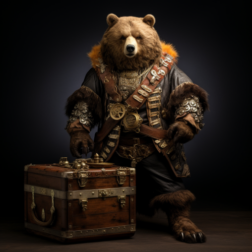 a grizzly bear wearing a black and white trenchcoat and fedora, Silver Shroud from Fallout outfit.