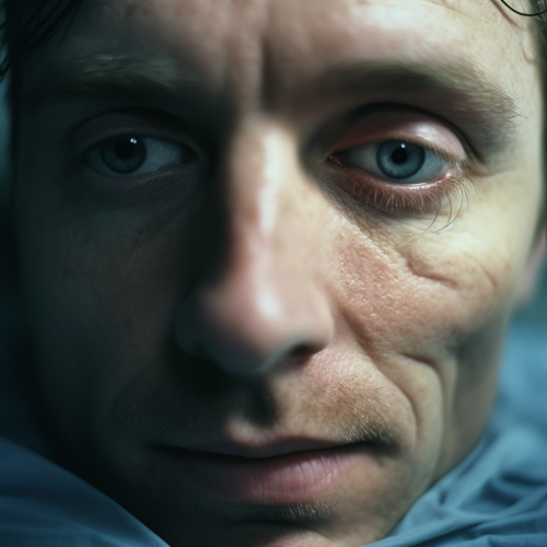 extreme close up, inmate in hospital bed, prison, UK, 21st century, 16mm film, interior, soft light