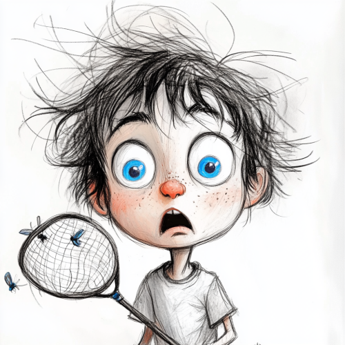 simple drawing of the little boy with a butterfly net (let's call him Micky), huge expression of surprise and wonder, the boy has messy hairs and bright blue eyes, children book illustration --v 6.1