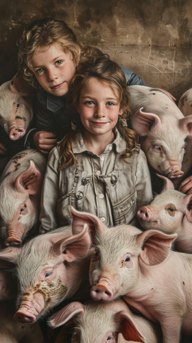 Hyper-realistic photo of chalk drawings on the walls of a farm barn, depicting a joyful little girl and boy surrounded by small pink pigs. --ar 9:16 --v 5.2