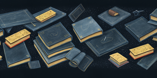 a chalk lines illustration of rescinded publications, in style of chalk lines drawing, on a plain dark blue blackboard background --ar 2:1