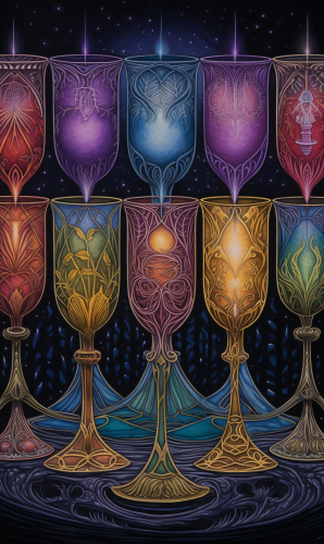 colored Pencil, very detailed, dinamic colors, Six of Cups from a Tarot Deck, fantasy elements --ar 897:1497